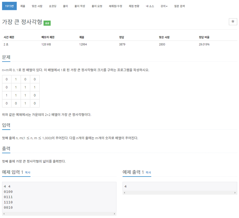 n*n배열에서 가장 큰 정사각형의 넓이를 구하는 문제입니다.
