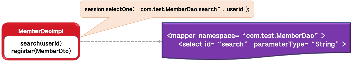 - SQL을 호출하는 프로그램은 SqlSession의 method의 argument에 문자열로 namespace + “.” + SQL ID로 지정