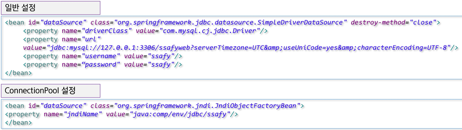 - 데이터소스는 dataSource 아이디를 가진 빈으로 데이터베이스 연결정보를 가진 객체