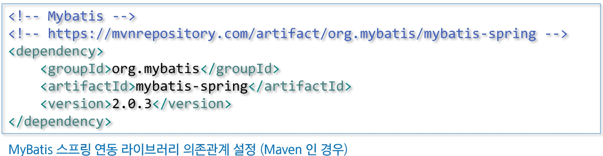 - MyBatis를 스프링과 연동하기 위해서는 MyBatis에서 제공하는 Spring 연동 라이브러리가 필요