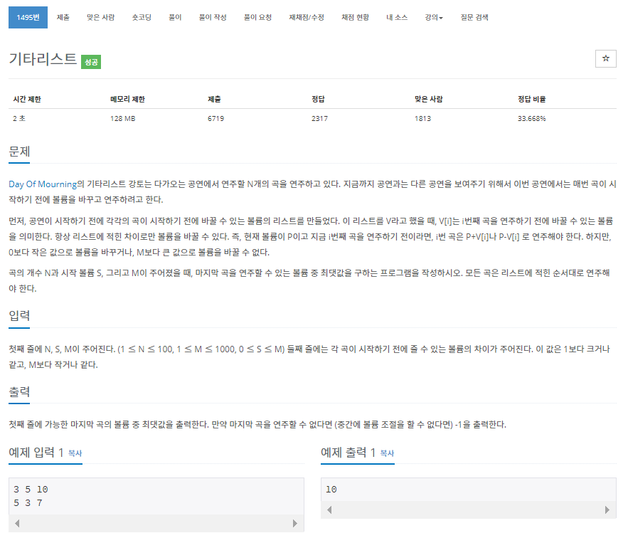 현재 가능한 음량에서 이번 노래의 소리를 더하고 뺀것을 DP[i][1]에 넣습니다.