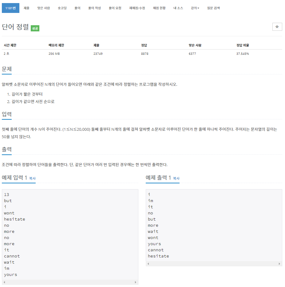 글자 길이가 같으면 글자순으로 정렬합니다.