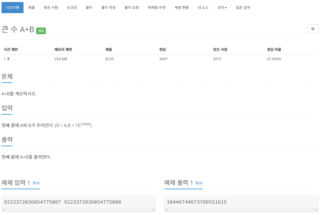 큰 수의 덧셈 문제입니다.