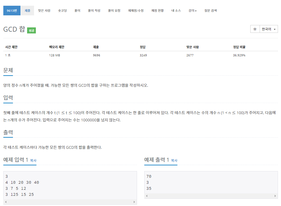 각 수에대한 모든 최대공약수의 합을 구하는 문제입니다.