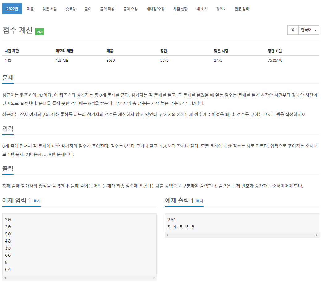 가장 큰 수 5개의 합과 인덱스를 오름차순으로 출력하는 문제입니다.