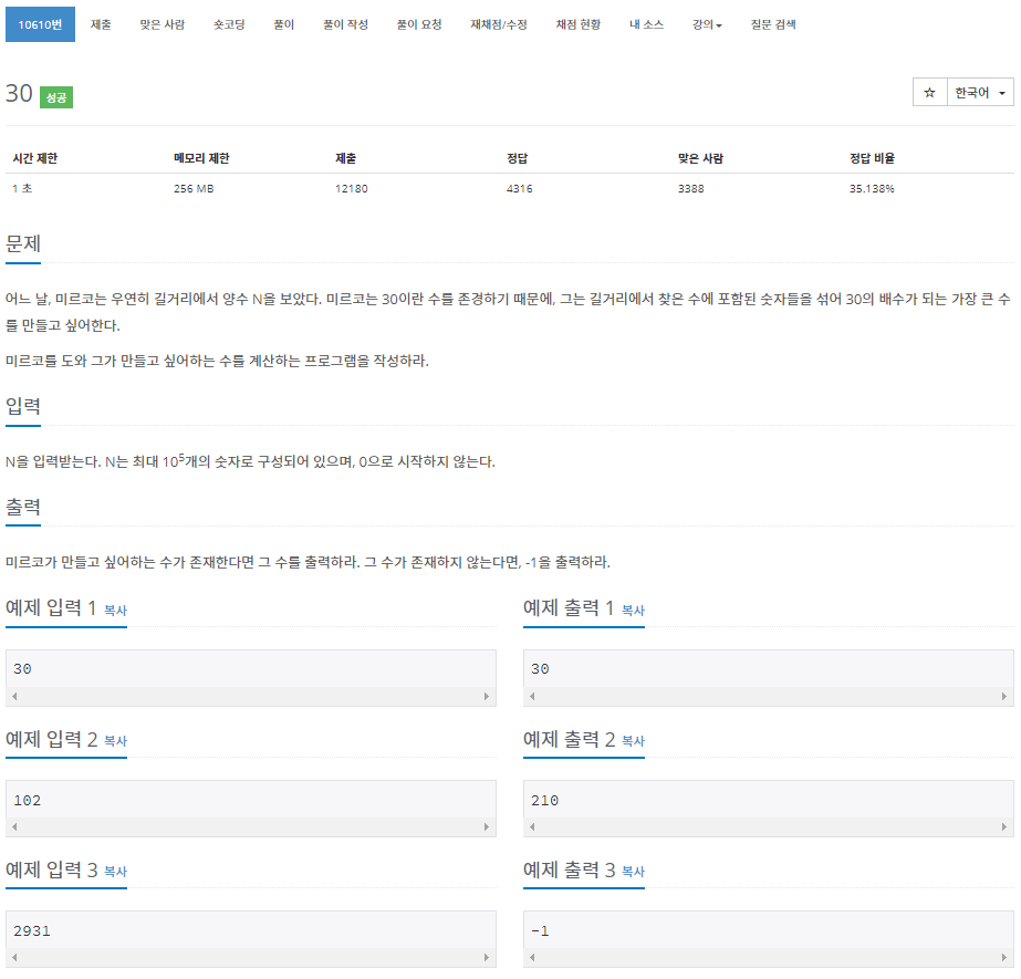 숫자들을 조합해서 30으로 나누어 떨어지는 가장 큰 수를 출력하는 문제입니다.