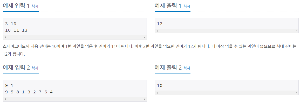 스네이크버드가 과일을 먹어서 길이가 길어질때 최대 길이를 구하는 문제입니다.