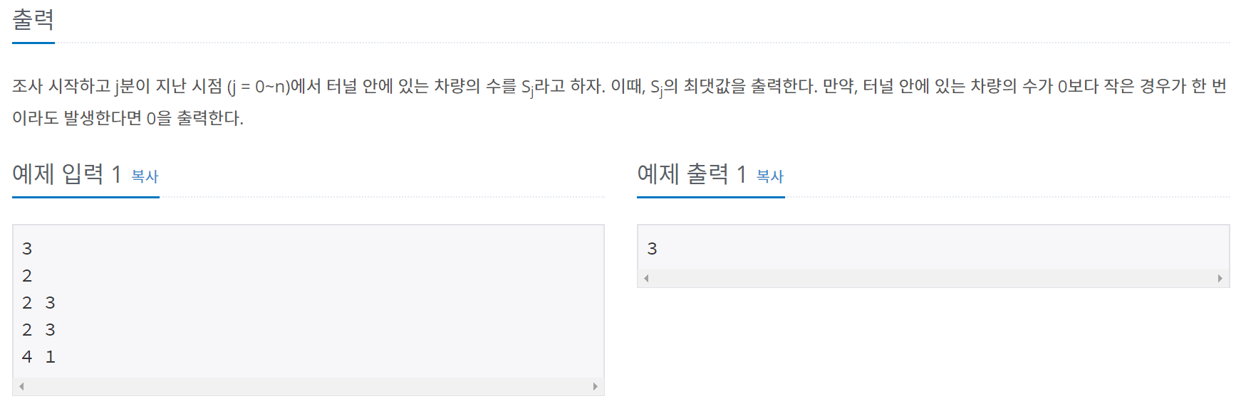 터널에 가장 차들이 많았을 때 수를 출력해야합니다.