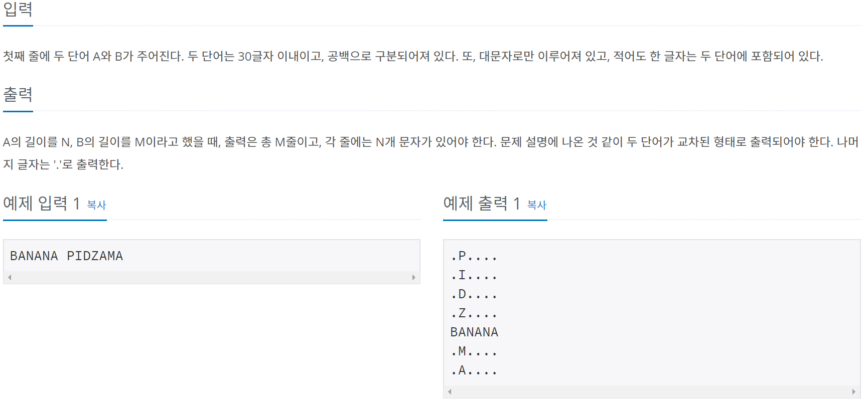 두개의 string을 받고 일치하는 부분으로 두 단어가 교차하게 출력하는 문제입니다.