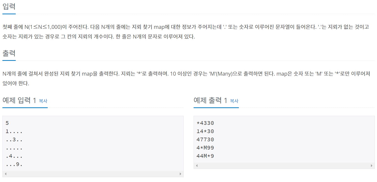 최종적으로 9를 넘으면 M으로, 지뢰면 *, 그 외에는 더해진 수를 출력하면 됩니다.