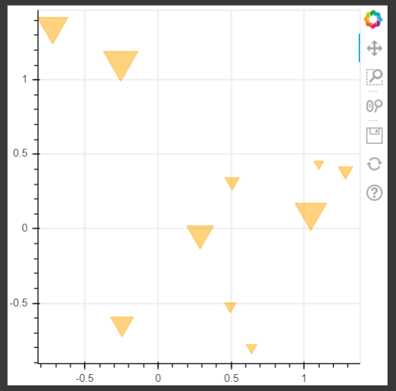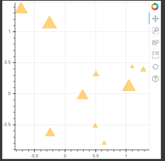 p.triangle(x, y, size=sz, color="orange", alpha=0.5) #삼각형 모양 오렌지 투명도 50% 산점도