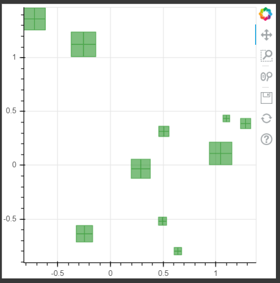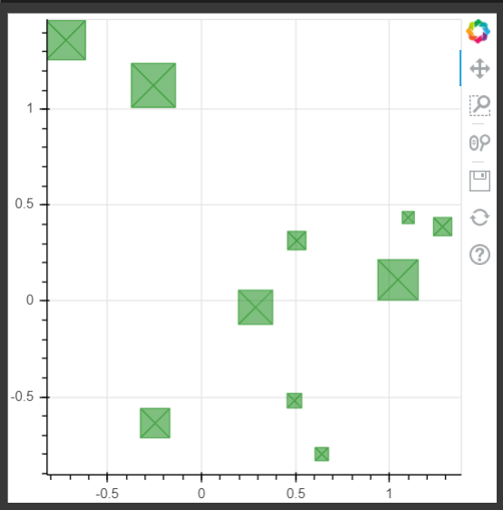 p.square_x(x, y, size=sz, color="green", alpha=0.5) #사각형, x 모양 오렌지 투명도 50% 산점도