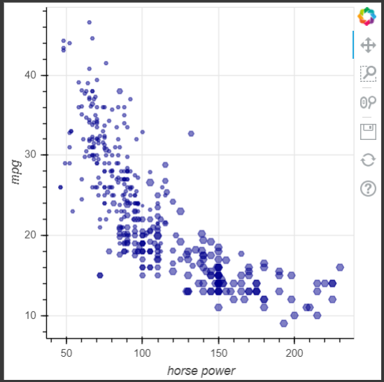 p.hex(autompg.hp, autompg.mpg, size=autompg.cyl, color="darkblue", alpha=0.5) #x축 hp, y축 mpg, size cyl