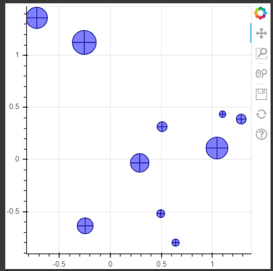 p.circle_cross(x, y, size=sz, line_color="navy", fill_color="blue", fill_alpha=0.5) #O+모양 테두리 navy, 안 파랑색, 투명도 50% 산점도