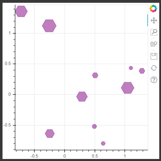 p.hex(x, y, size=sz, color="purple", alpha=0.5) #육각형 모양 보라, 투명도 50% 산점도