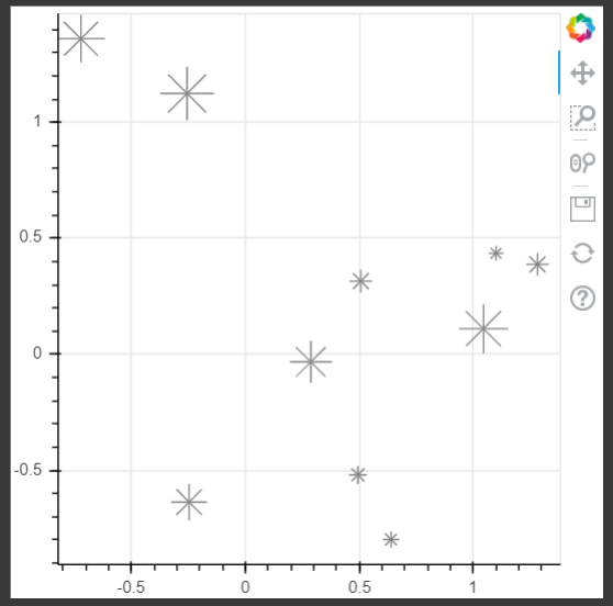 p.asterisk(x, y, size=sz, line_color="gray") #*모양 회색 산점도