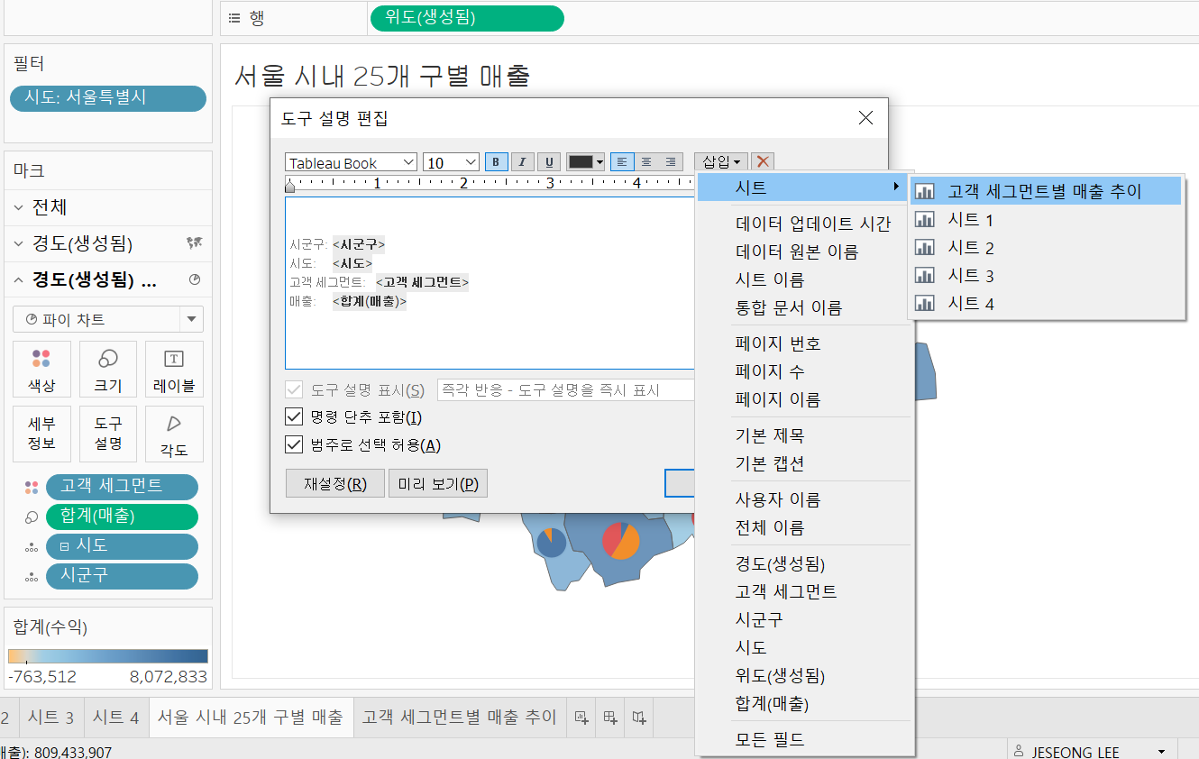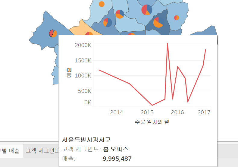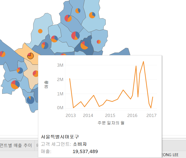 맵 차트에서 파이차트에 마우스를 올렸을 때 고객세그먼트별 매출 추이를 확인해보겠습니다.