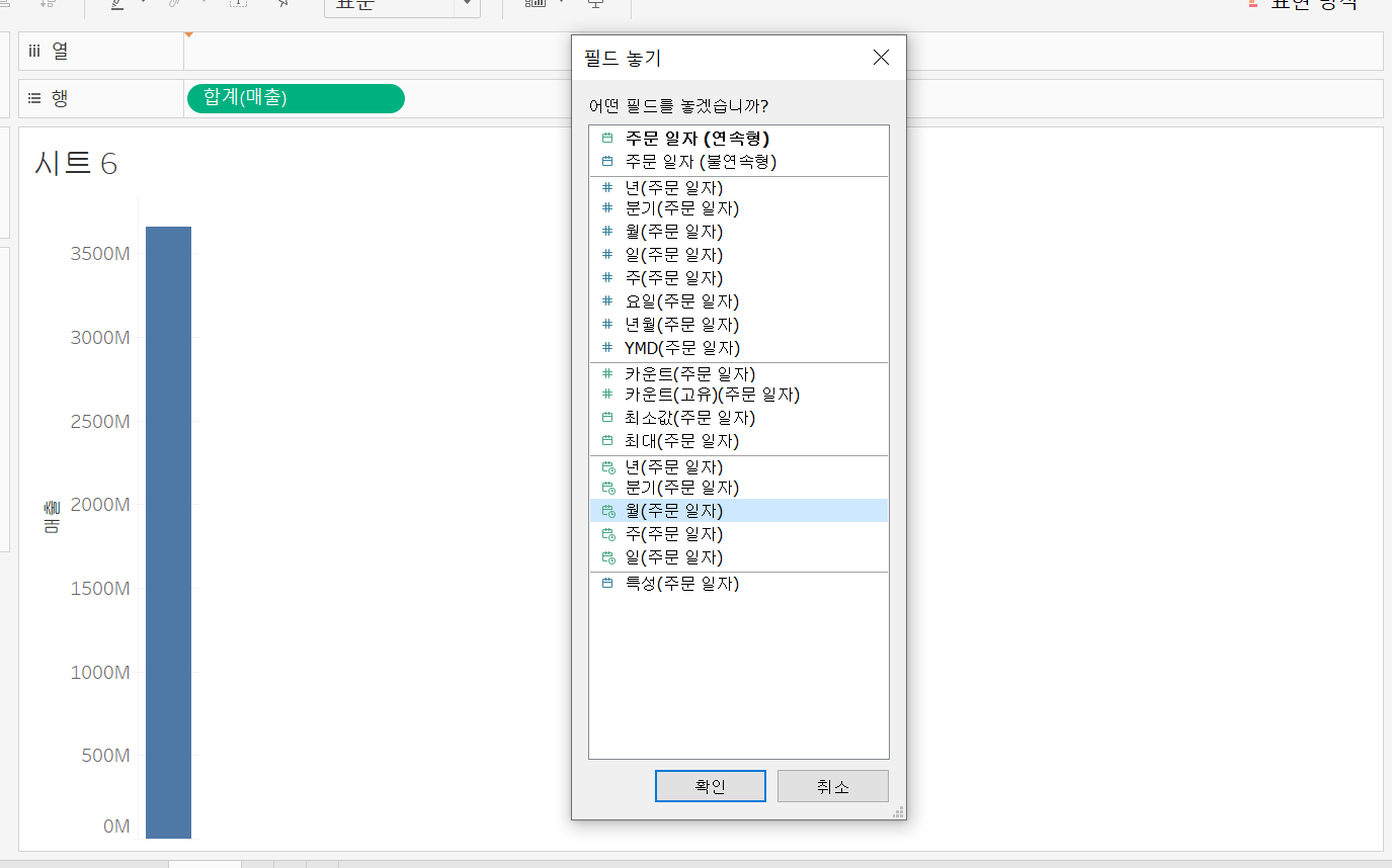 주문일자를 어떤 필드로 넣을지 선택하는 창이 나오는데 불연속형 월(주문 일자)를 선택합니다.