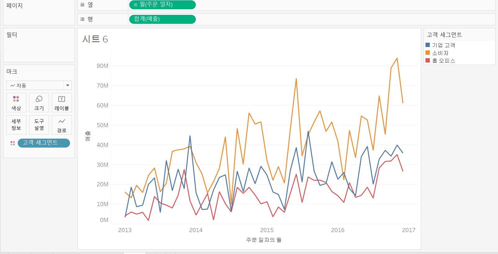 윗부분에 삽입 - 시트 - 고객 세그먼트별 매출 추이 (위의 이미지인 라인차트)를 클릭합니다.