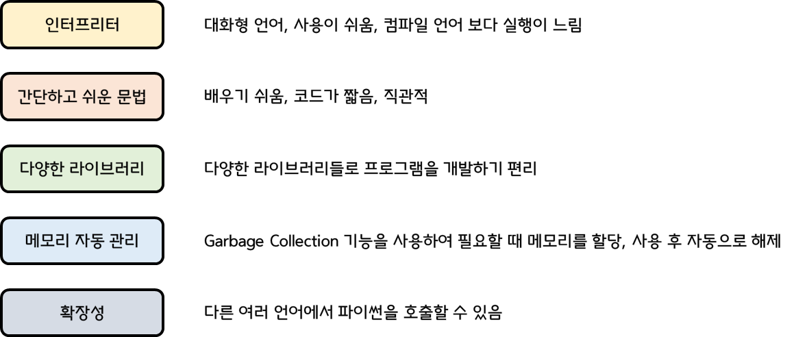 파이썬은 프로그래밍 언어의 하나로 다음과 같은 특징을 가짐.