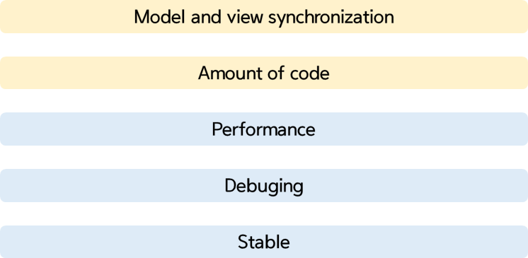 모델, 뷰 동기화 - 데이터 변화를 감지하여 모델과 뷰가 같도록 만들어줌. (단방향은 같게하기위한 추가적인 코드가 필요)