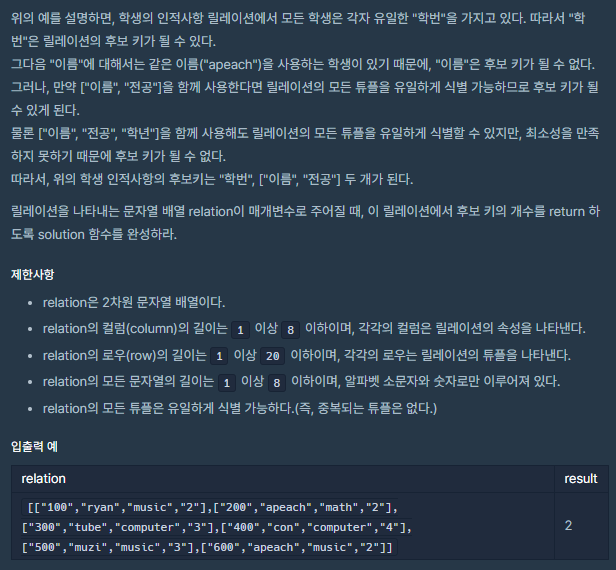 릴레이션이 주어지고 후보키를 구하는 문제입니다.