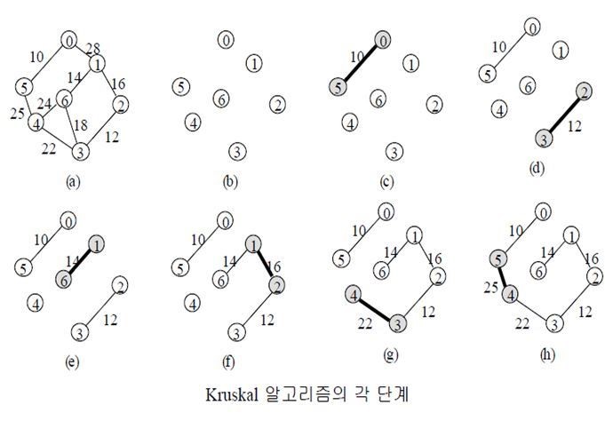 탐욕적인(Greedy) 방법을 이용하여 그래프의 모든 정점을 최소비용으로 연결하는 최적 해답을 구하는 것