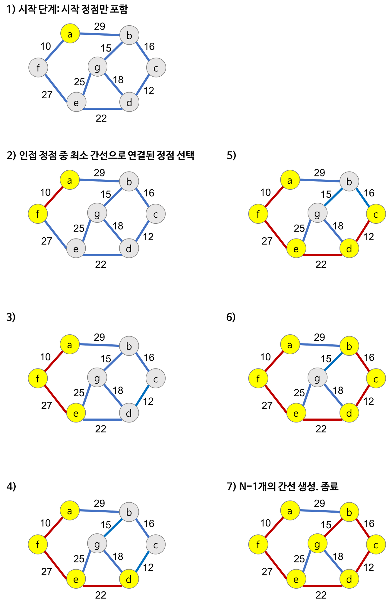 시작 정점에서부터 출발하여 신장트리 집합을 단계적으로 확장해나가는 방법