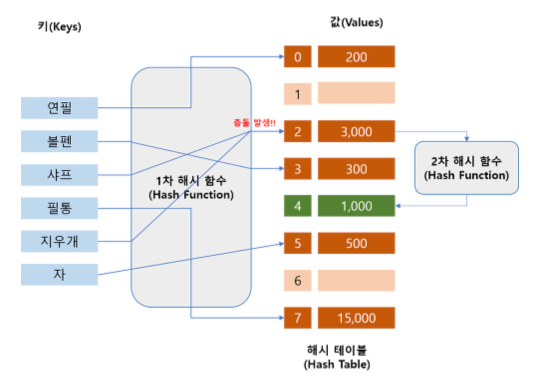 해시 충돌시 다른 함수를 한번 더 적용한 결과를 이용