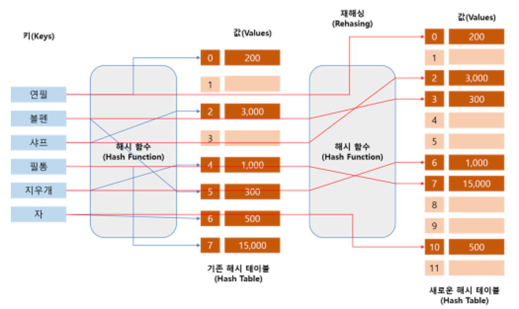 개방주소법에서 사용되는 고정 크기의 배열이 가득 차거나 체이닝의 연결 리스트가 길어지게되면