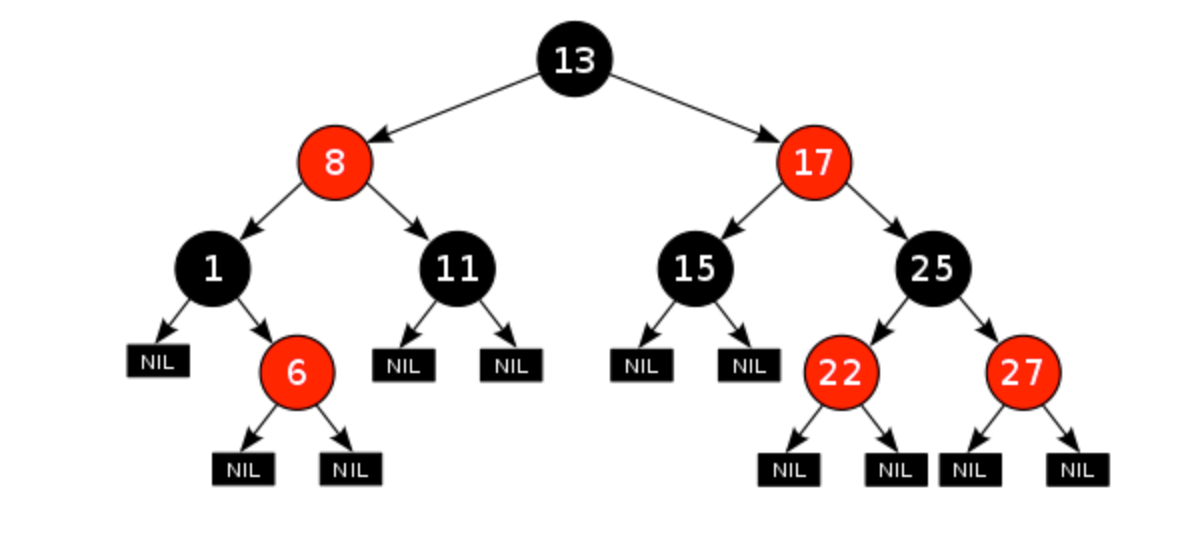 - 빨간노드는 두 개의 검정 노드를 가짐 (자식이 없을 경우 블랙 NIL 노드를 가짐)