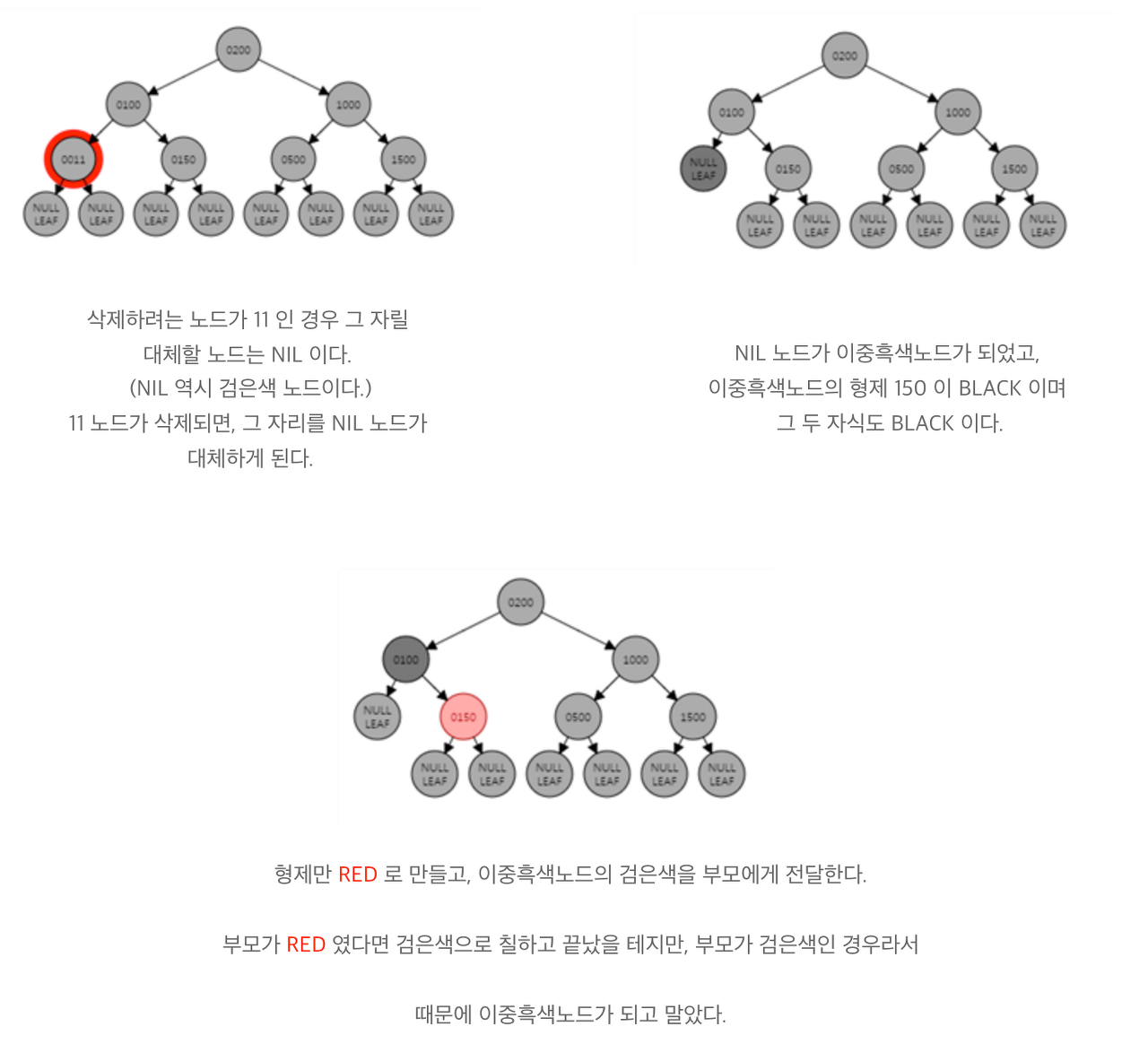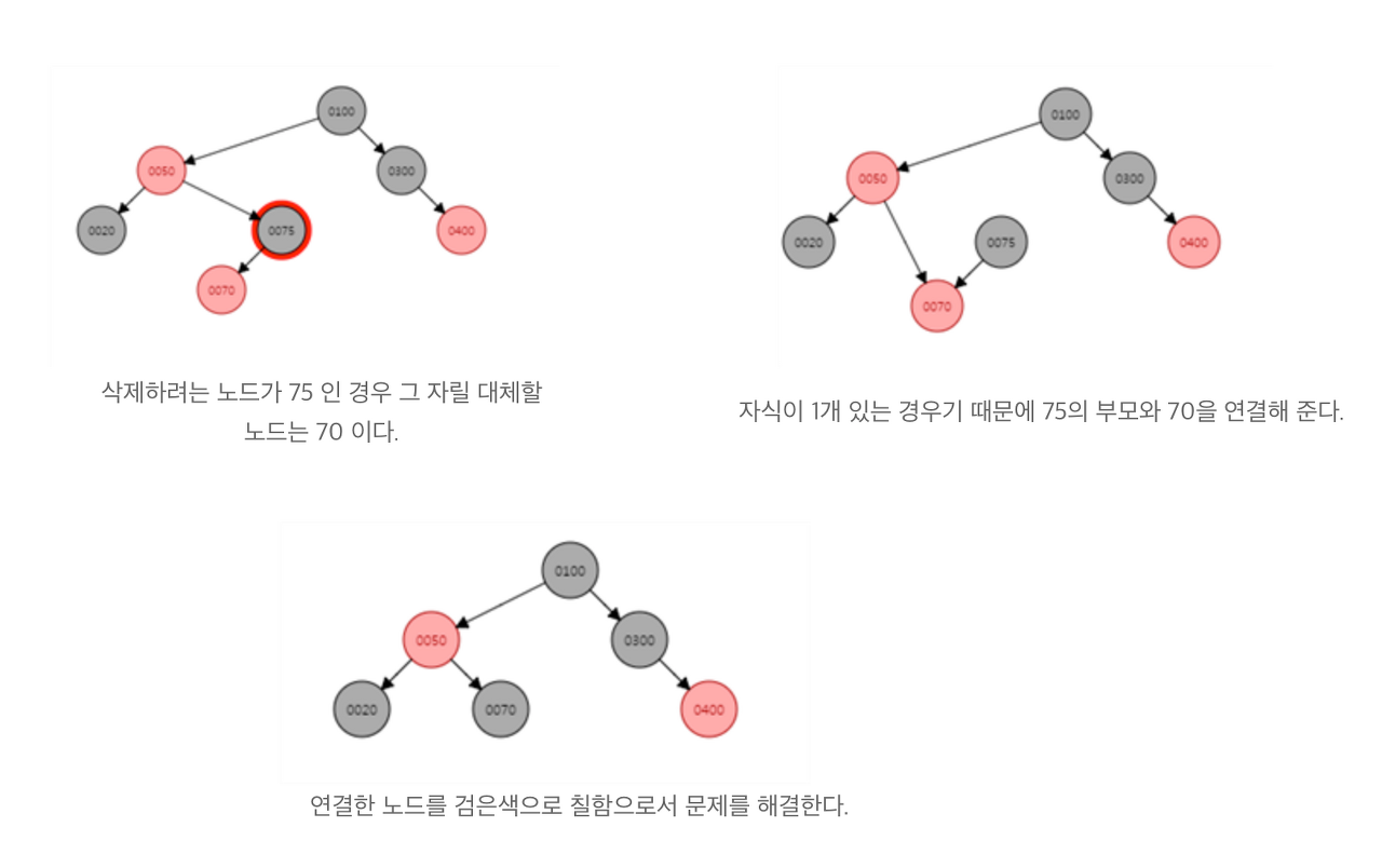 - 삭제된 노드가 검은색인 경우 그 자리를 대체하는 노드를 검은색으로 칠함