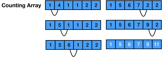 배열내의 수의 개수를 저장해서 작은 수부터 개수만큼 값을 입력해서 정렬하는 방식