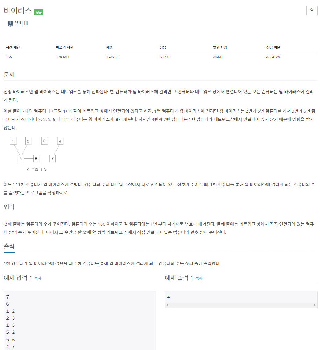 연결된 컴퓨터끼리 바이러스가 퍼질 때 1번을 통해서 감염된 컴퓨터의 수를 찾는 문제입니다.