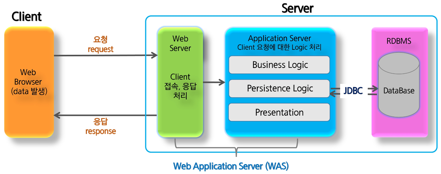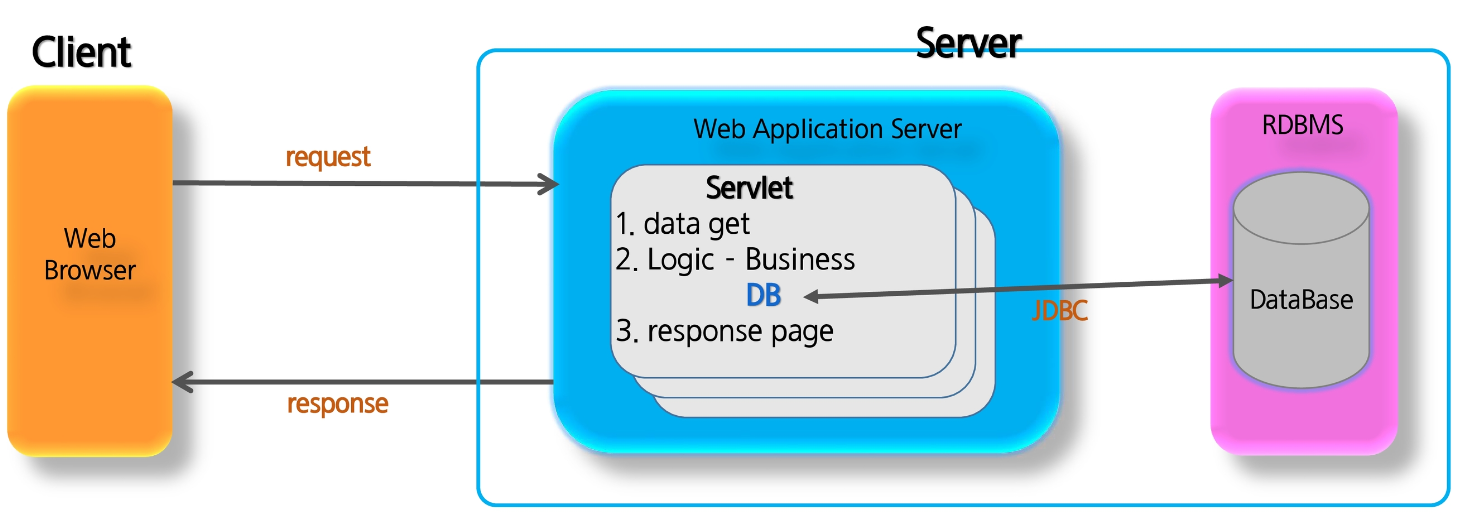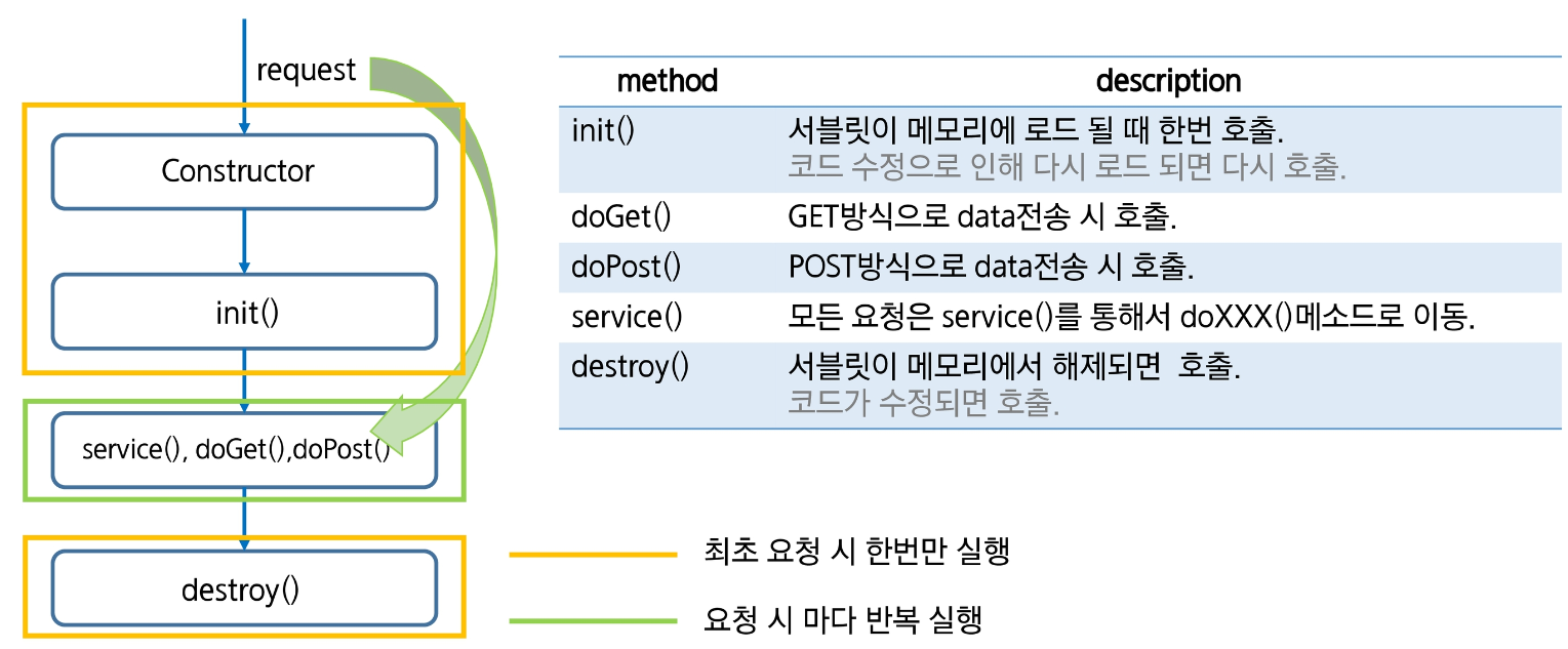 Client가 요청(request)을 하게 되면 Servlet Container는 Servlet객체를 생성(한번만)하고, 초기화(한번만) 하며 요청에 대한 처리(요청시마다 반복)를 하게 된다. 또한 Servlet객체가 필요 없게 되면 제거하는 일가지 Container가 담당하게 된다.