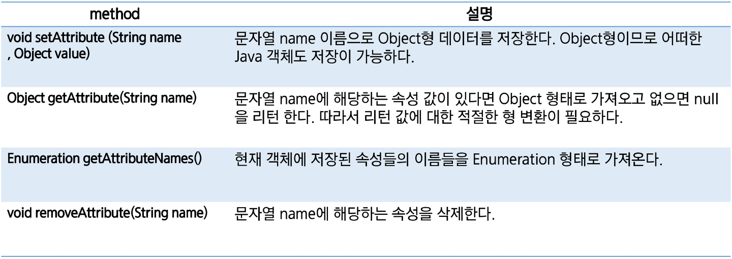 servlet과 jsp페이지 간에 특정 정보를 주고 받거나 공유 하기 위한 메소드를 지원